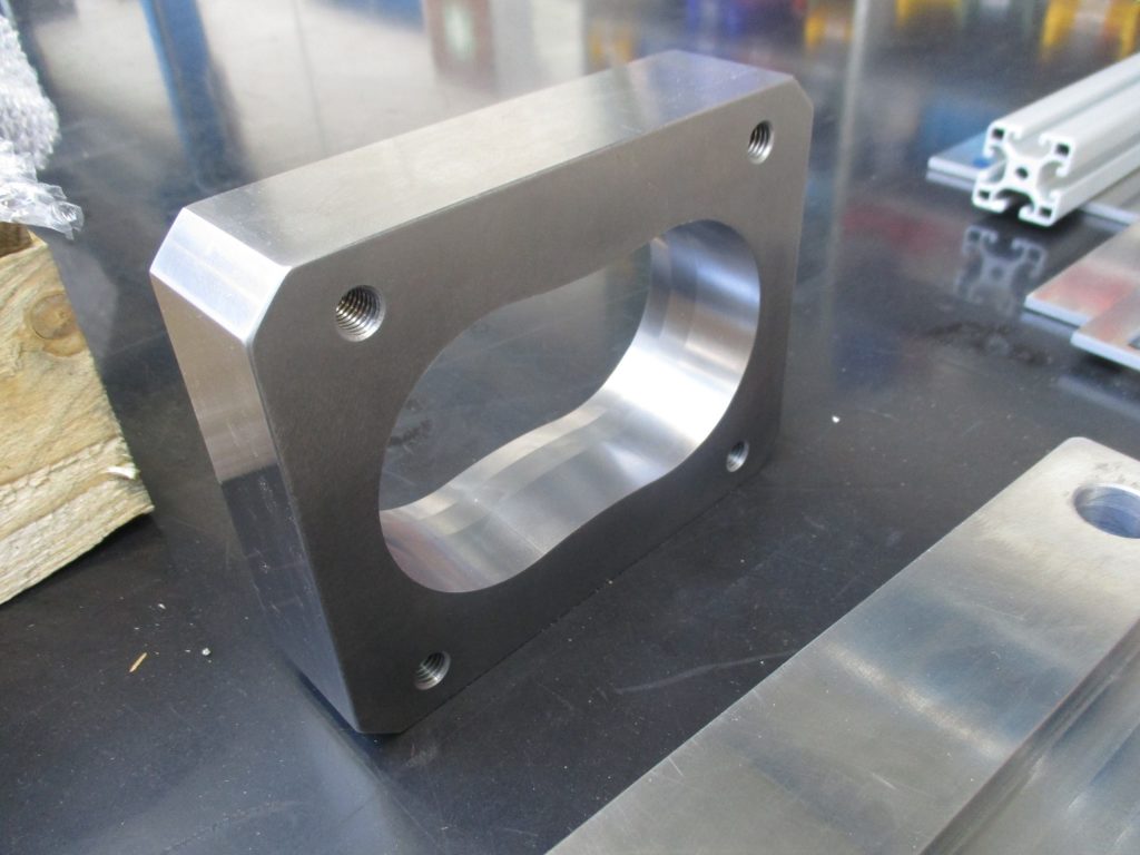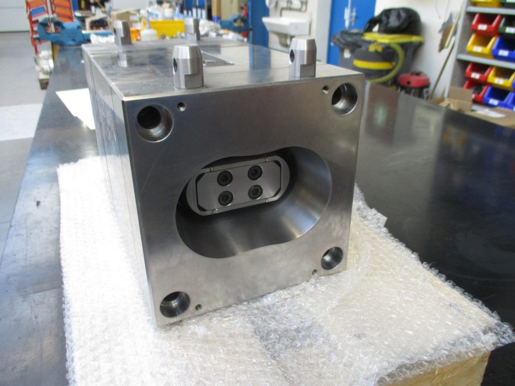Outillage de conformage et de rétreint de tube acier contenu dans une section de 200 mm x 200 mm.Poinçonnage double par vérin hydraulique, guide poinçon, matrice supérieure et matrice inférieure.